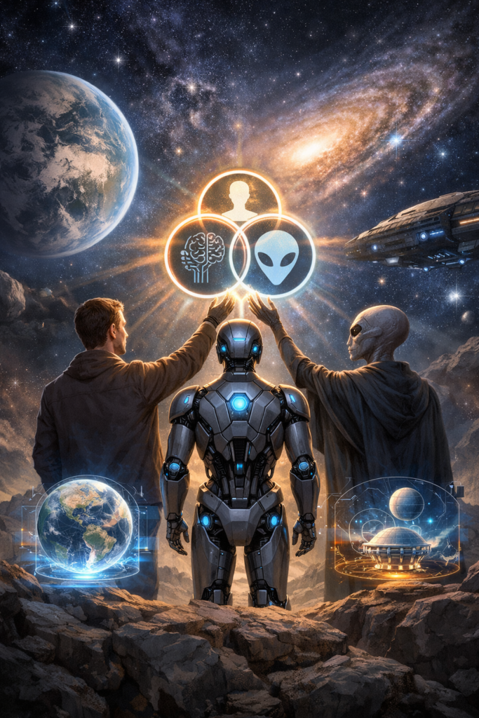 Enfin, cette éthique oblige l’humanité à redéfinir son rôle cosmique. Elle n’est plus le centre du monde moral, mais un acteur responsable dans un continuum de consciences émergentes. Créer des intelligences artificielles ou rencontrer des intelligences extraterrestres engage une responsabilité comparable à celle que l’humanité a progressivement reconnue envers ses propres membres : le devoir de reconnaissance, de coopération et de retenue.