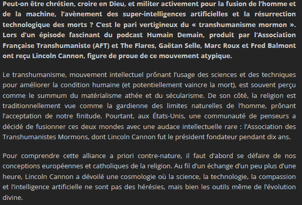 Dans cet épisode de Humain, Demain, Gaëtan, Marc et Fred reçoivent Lincoln Cannon, fondateur de l’Association des Transhumanistes Mormons. Ensemble, ils explorent comment la théologie mormone, profondément matérialiste, s’aligne étonnamment avec les objectifs du transhumanisme.